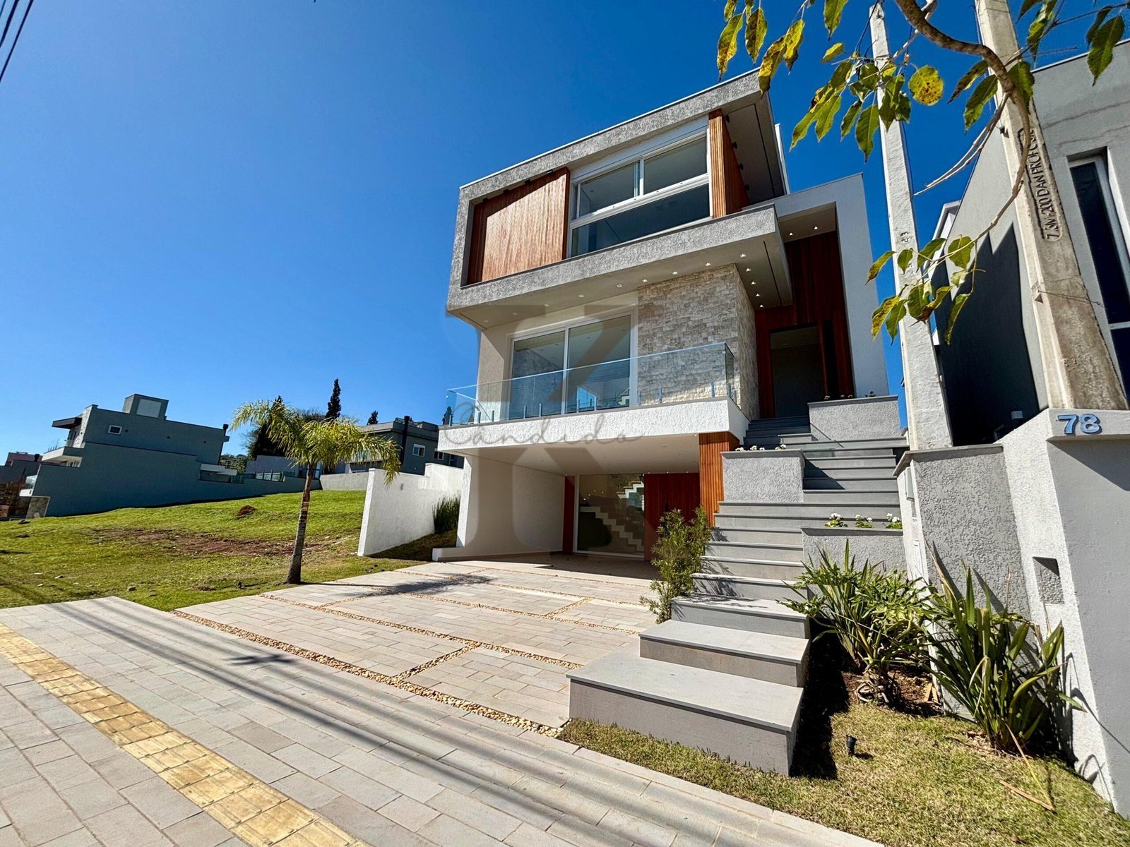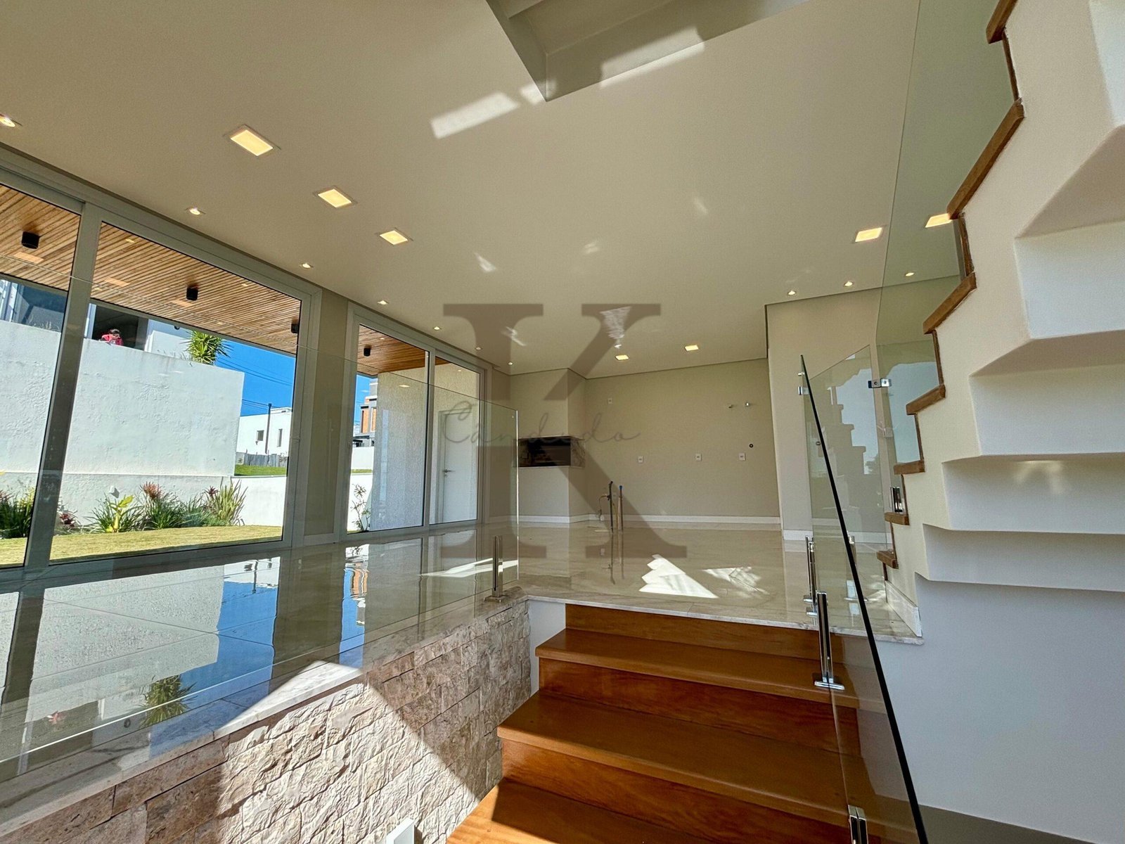 Com 250 m² de área construída, o imóvel conta com 3 suítes – sendo a master com banheira de imersão, dois closets e uma vista deslumbrante do pôr do sol. Ambientes amplos e integrados, acabamento em madeira nobre, porcelanato 1,20 x 1,20 e detalhes em pedra natural (Branco Paraná e Travertino) elevam o padrão de qualidade.